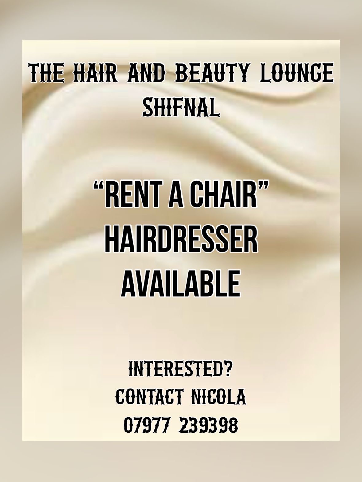 Hairdressing chair to rent full or part time. We are a Hair and Beauty salon set over 3 floors. Hair is on the ground floor